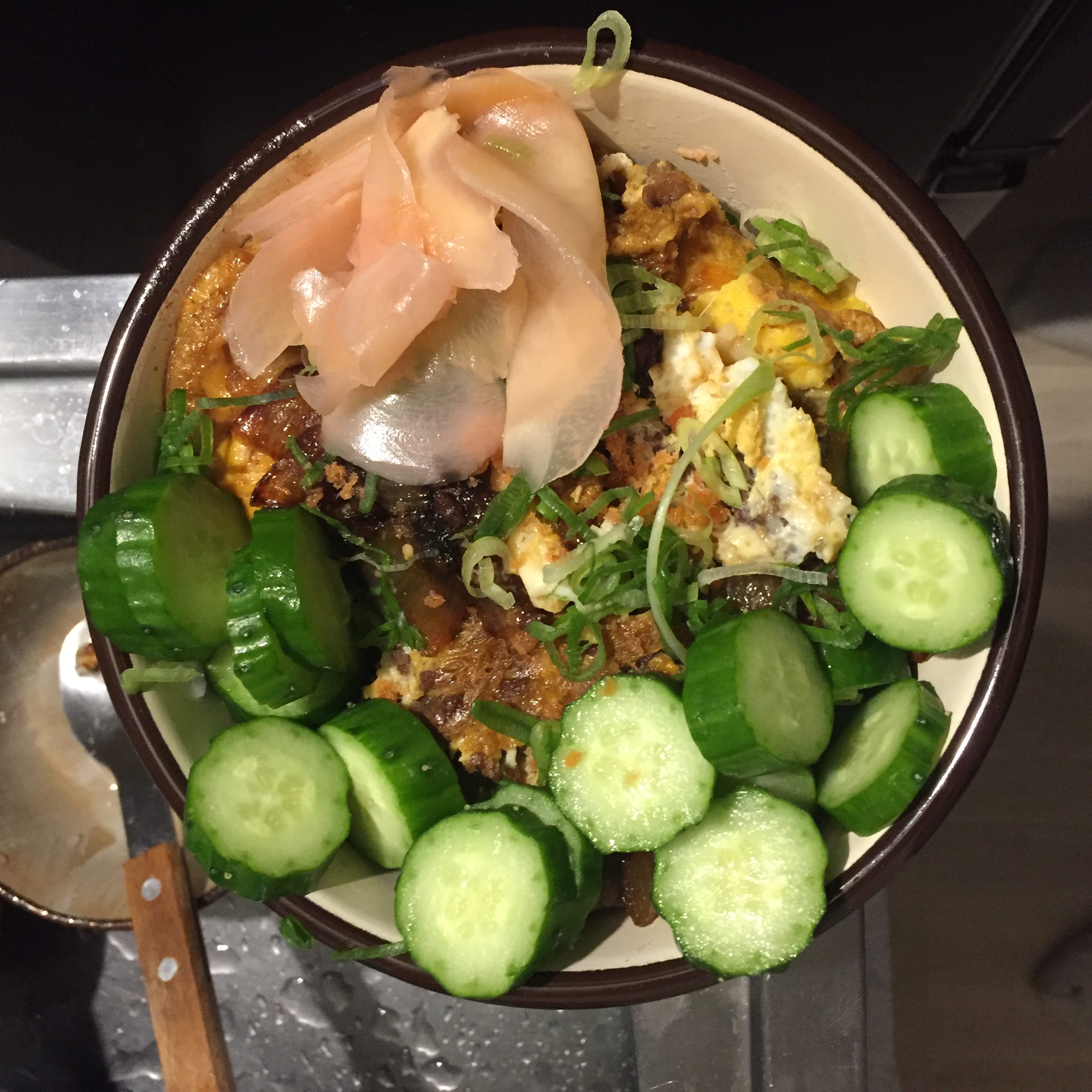 The finished gyudon over rice. Maybe less egg next time, but it was definitely delicious.